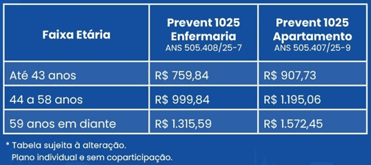 Tabela sujeita a alteração sem aviso prévio por parte da operadora. Faça uma simulação gratuitamente e receba todos os valores atualizados no seu e-mail.