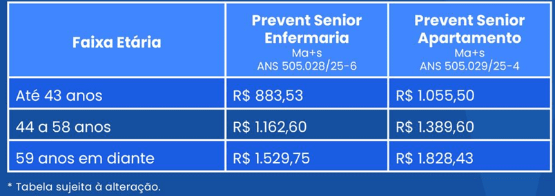 Tabela sujeita a alteração sem aviso prévio por parte da operadora. Faça uma simulação gratuitamente e receba todos os valores atualizados no seu e-mail.